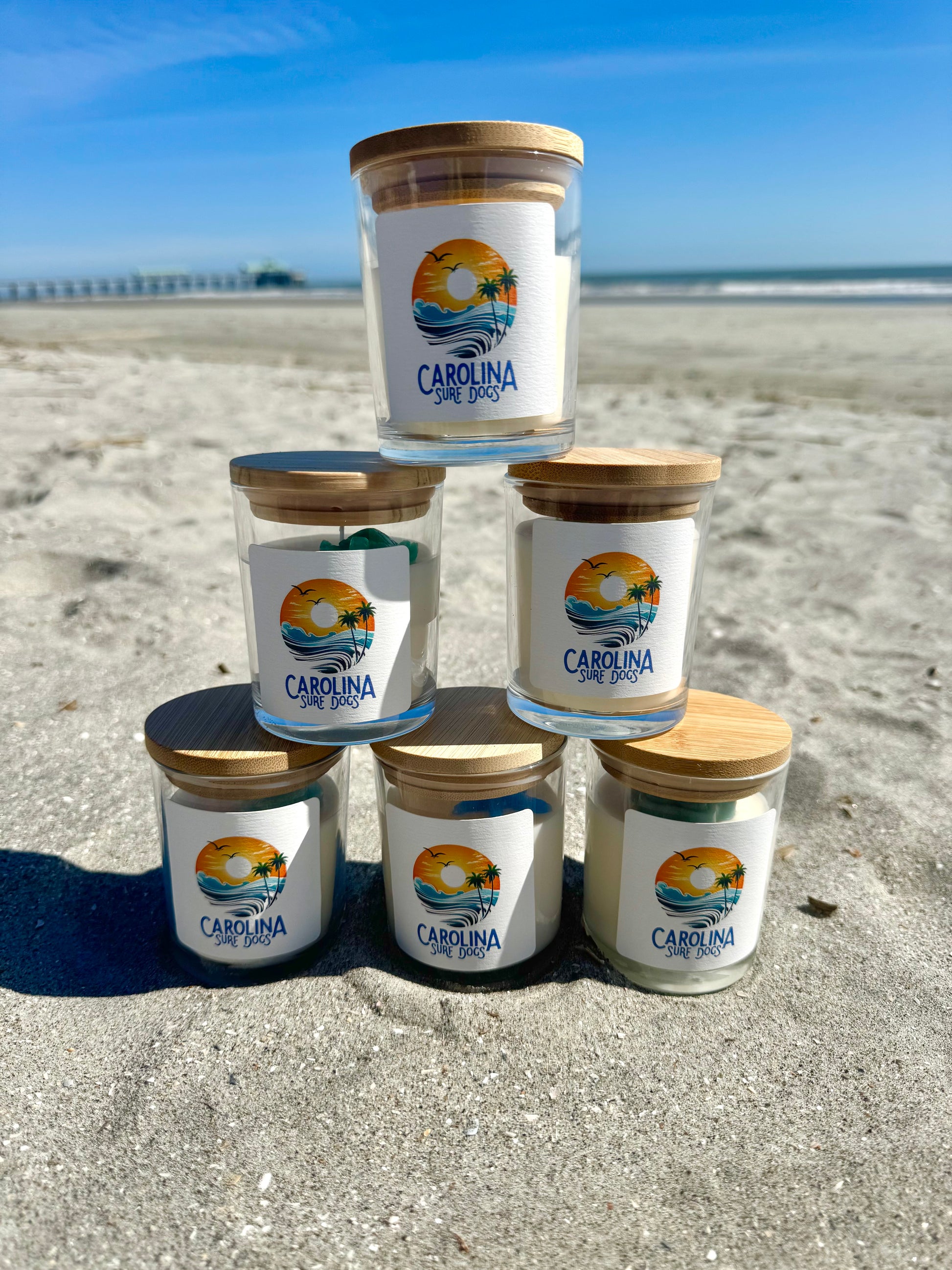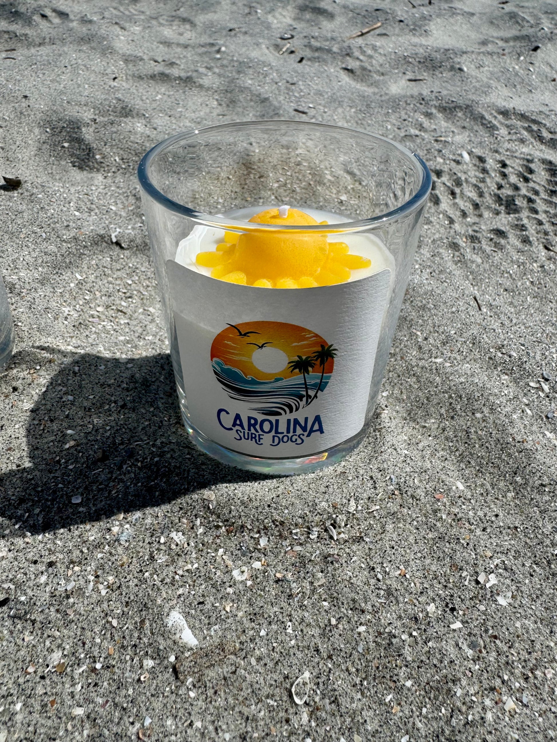 7 oz soy candles with cute beeswax candle toppers. Smells like a day at the beach.